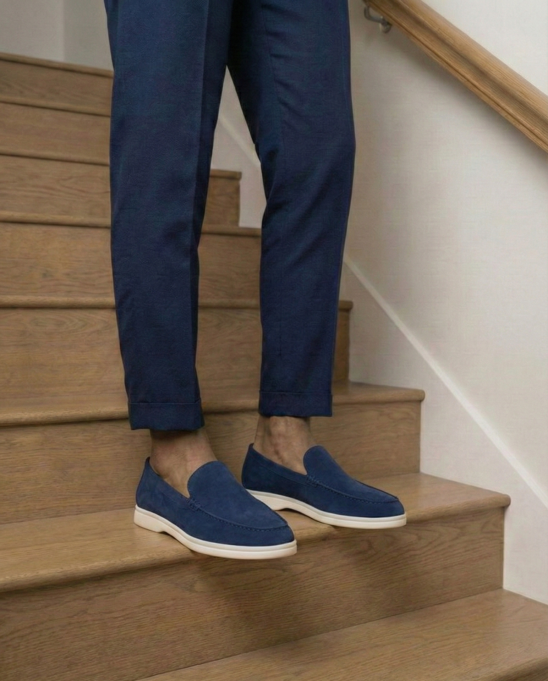 The Amari Blue Suede Loafers are built for effortless versatility. Pair them with slim black or charcoal trousers for a refined, office-ready look, or keep it relaxed with dark denim and a crisp white tee for weekends.
